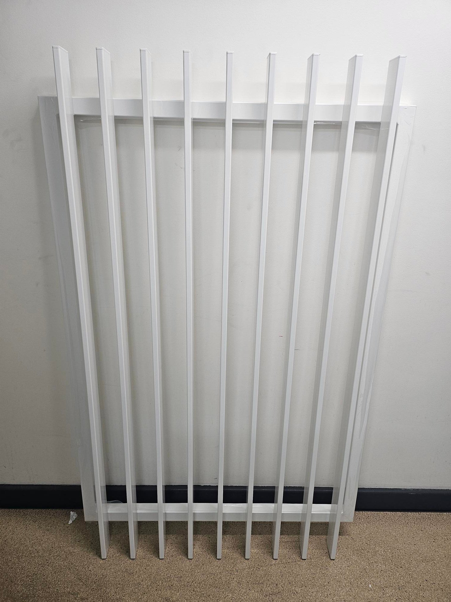 Powder coated satin black, monument or white aluminium pool safe vertical blade fence gate panel (radiator panel) including top caps. Fully welded ready to install.